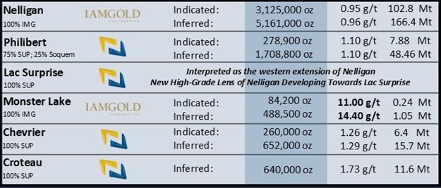 The Philibert Project is located 9 km from IAMGOLD Corporation’s Nelligan[2] Gold project. Philibert hosts a maiden 43-101 inferred resource of 48.46 Mt for 1,708,800 ounces at 1.10 g/t Au and an indicated resource of 7.88 Mt for 278,900 ounces at 1.10 g/t Au.[3] Northern Superior holds a majority stake of 75% in the Philibert Project, with the remaining 25% owned by SOQUEM, and retains an option to acquire the full 100% ownership of the project. Chevrier hosts an inferred mineral resource of 15.7 Mt for 652,000 ounces at 1.29 g/t Au (underground and open pit) and an indicated mineral resource of 6.4 Mt for 260,000 ounces at 1.29 g/t Au.[4] Croteau hosts an inferred mineral resource of 11.6 Mt for 640,000 ounces at 1.73 g/t Au.[5] Lac Surprise hosts the Falcon Zone Discovery, interpreted to be the western strike extension of IAMGOLD Corporation’s Nelligan Gold project, while Monster Lake East and Monster Lake West are located on either side of IAMGOLD’s Monster Lake Project.