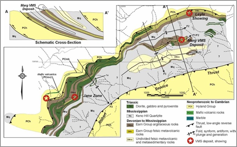 Previous operators conducted stream, soil and rock geochemical sampling and geological mapping in 1982, 1988, 1989 and 2007. Initial geological mapping revealed stratigraphic similarities to the Marg Zone and this was confirmed by property wide geological mapping in 2000. Soil sampling revealed a 600 m long, 50 to 100 m wide discontinuous but coincident lead-zinc-copper geochemical anomaly. A brief prospecting traverse in 1988 located small fragments of strongly oxidized, sulphide mineral bearing rock in coarse talus below a steep slope at the head of Jane Creek and within the above geochemically anomalous area. The best assay from this work was 0.29% Cu, 4.34% Pb, 5.14% Zn, 38.4 g/t Ag and 0.3 g/t Au. Further work is required to follow up on the drill results with additional mapping with rock chip sampling to identify potential sulphide bearing horizons. Additional drilling should target the results from the VTEM interpretation using the mapped favourable horizons as a guide now that the structural regime in this area is better understood.